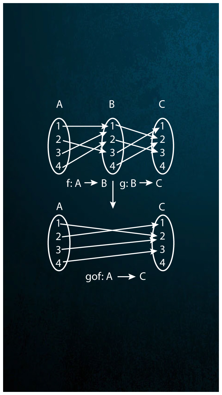 Let f: A -> B and g: C -> D, then the composite function, gof: A->D is defined by gof(x)=g[f(x)], provided the range(f) ∁ Domain(g)