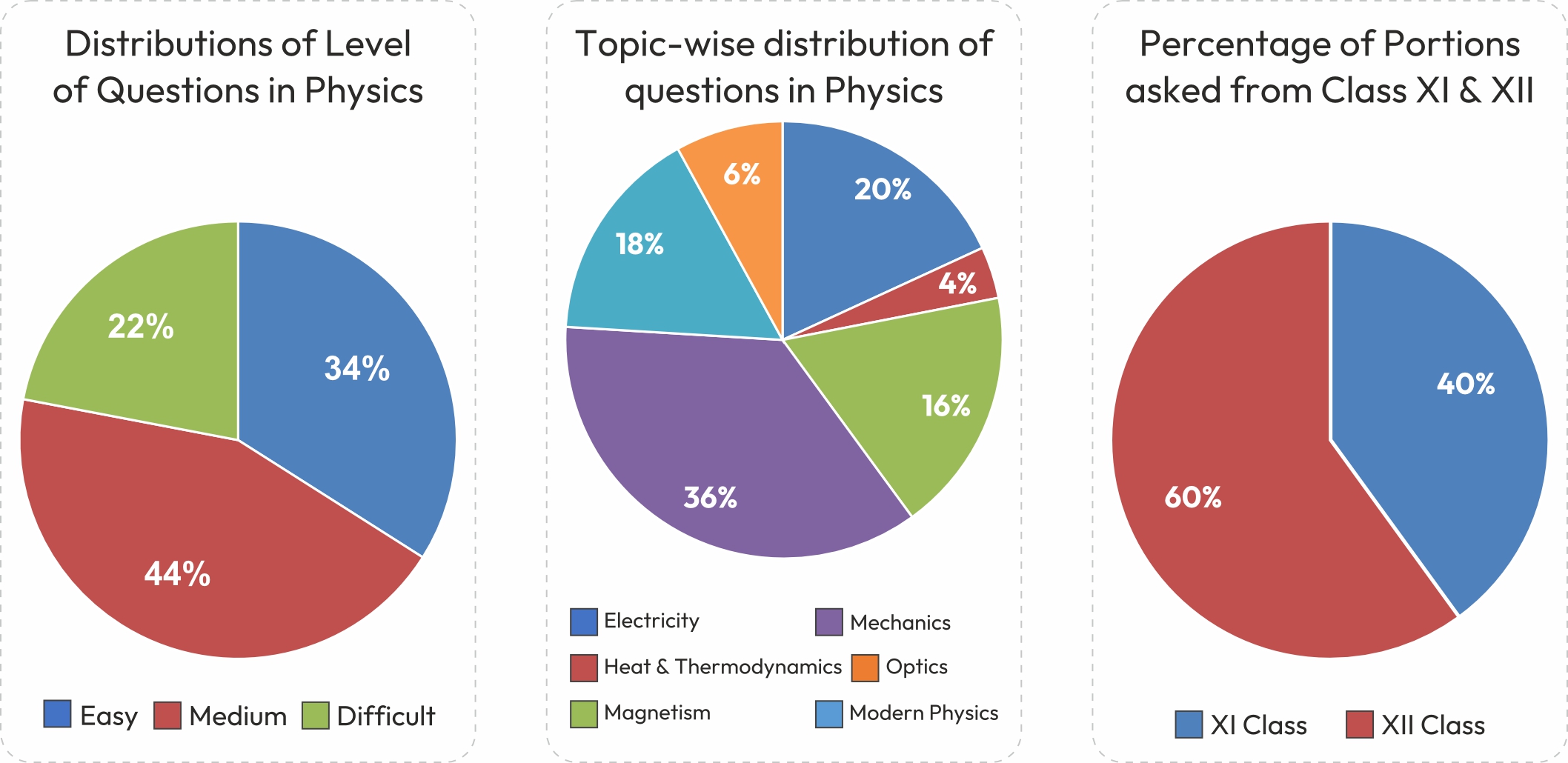 Physics was of easy to moderate level. It had 17 easy, 22 medium and 11 difficult questions. The following table and pie chart show the question count arranged accordingly as per the class, chapter name / topic and the level of difficulty.